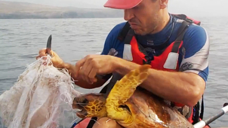 Mens de sejler ved Gran Canarias kyst, får de to kajakroere øje på en lidende havskildpadde med et net rundt om halsen.