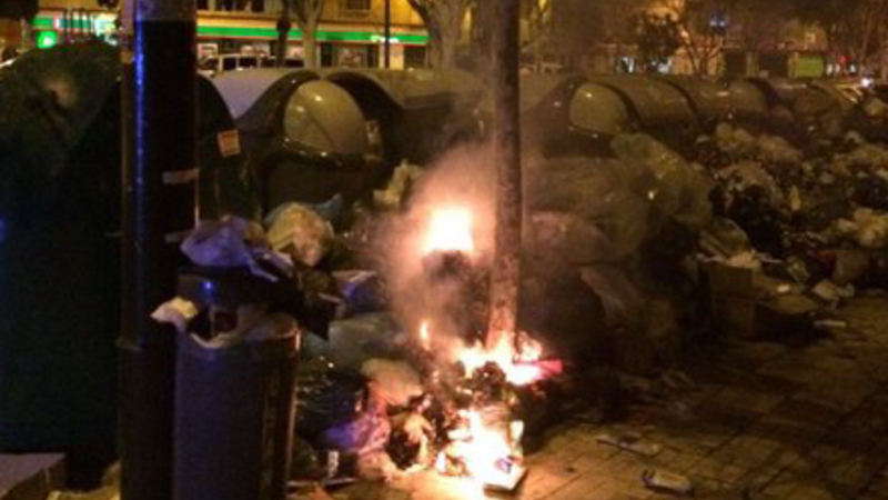 VIDEO: Højspændt situation i Málaga har givet tonsvis af ildelugtende affald i gaderne. I går var der brand i gaderne og anholdelser.
