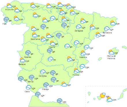 Dagstemperaturerne falder i dag i store områder af landet, mens de stiger på De Kanariske Øer. Nattemperaturerne falder i den nordøstlige og sydøstlige del af halvøen. Frost i bjergene - mest intens i Pyrenæerne.