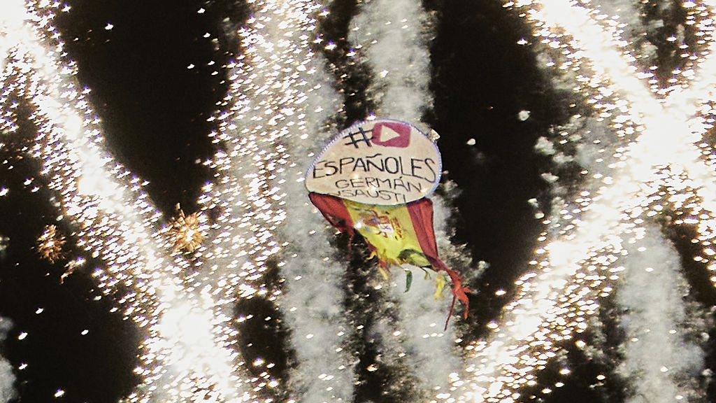 Dronen fløj rundt med det spanske flag og et sort skilt et YouTube-lignende logo, et hashtag-tegn, ordet ‘españoles’ og navnet Germán. Den kunne ses ret tydeligt på de spanske tv-kanaler.