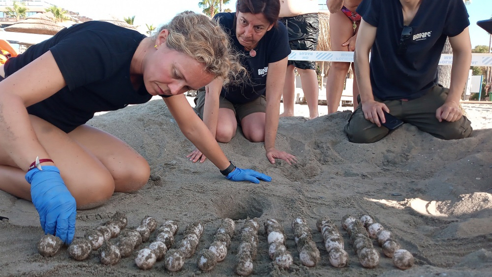 Mens eksperter tager sig godt af æggene i zoologisk have i Fuengirola, ligger størstedelen af æggene altså stadig på stranden i Marbella, og her er reden indhegnet og under konstant overvågning - døgnet rundt - på playa Mistral ved Hotel Guadalpín Puerto Banús og Chiringuito Mistral. Og det er frivillige, der hjælper til med det.