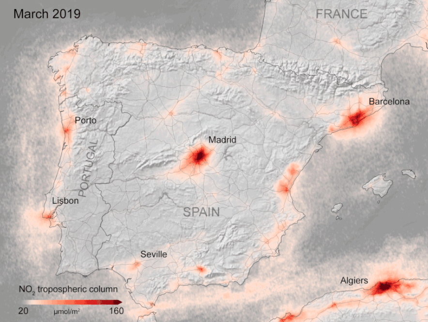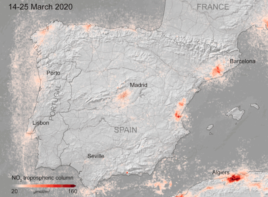 Niveauerne af nitrogendioxid, NO2, i Madrid faldt med hele 60 procent i den anden halvdel af marts, og det var jo kun begyndelsen af alarmtilstanden, hvor folk er beordret til at blive hjemme på grund af coronavirus-krisen.