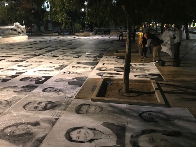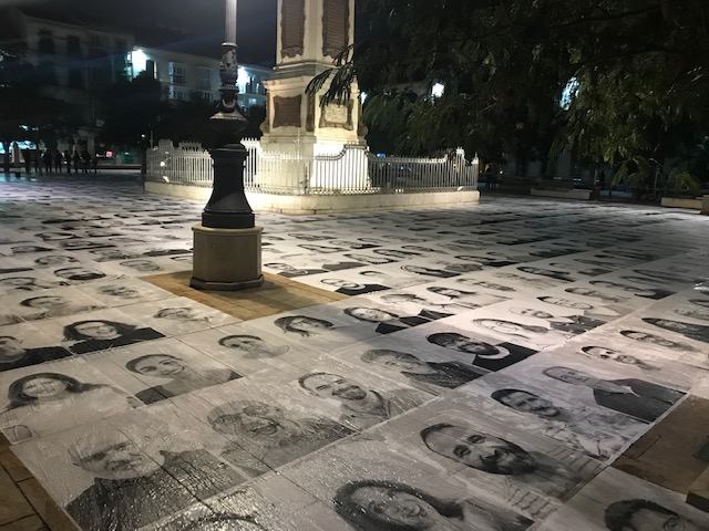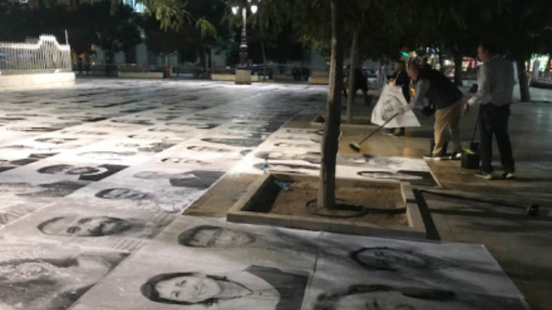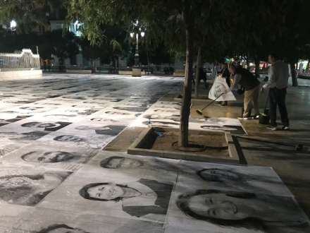 De mange portrætter er blevet klistret til fliserne rundt om den emblematiske obelisk Torrijos-monumentet.