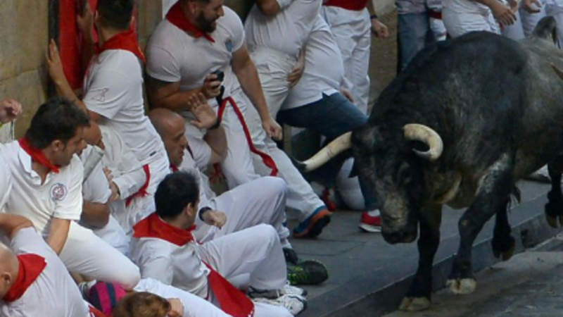 Den 29. årige var den første, der fik tyrenes horn at mærke, og det endda lige i skridtet. Mens den unge mand nok ikke kommer sig psykisk lige foreløbigt, er han heldigvis sluppet for permanente mén.