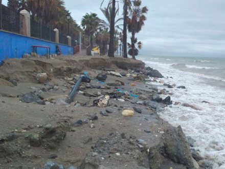 Længst mod øst ved Playa Real de Zaragoza er stranden voldsomt indsnævret med over 400 meter, og igen er rørføringen blevet blotlagt.