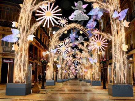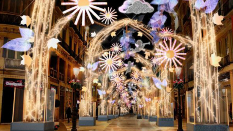 Calle Larios bliver pyntet med solskin, engle og efterårsblade ved hjælp af 22 buer med i alt af 730.000 små LED-pærer.