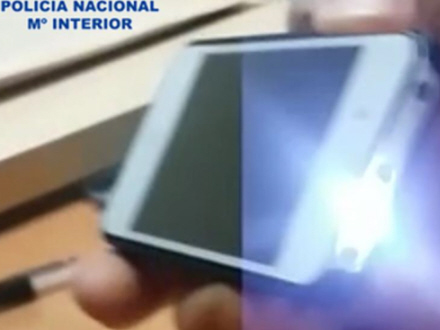 Fire personer er anholdt for at overfalde en kvinde med en strøm-pistol kamufleret i en mobiltelefon. Ifølge eksperter er det første gang, man er stødt på den type våben.