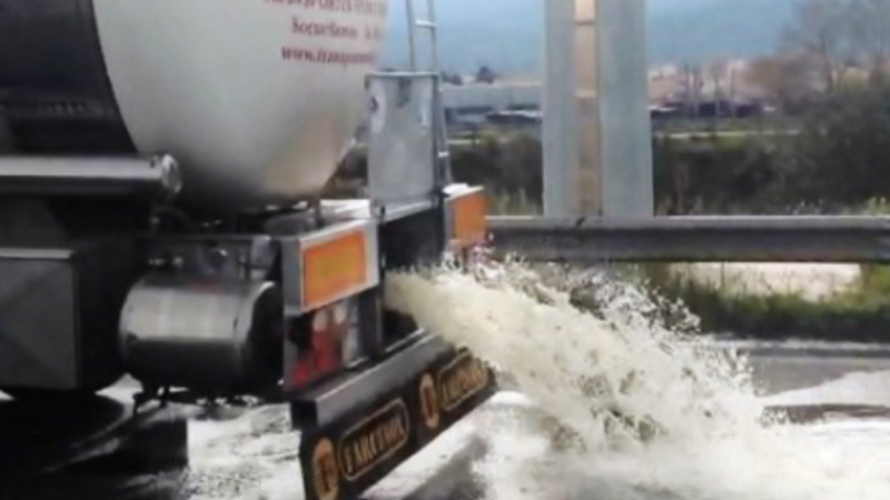 Landmændene spildte vinen som en protest imod de faldende spanske priser, som de har svært ved at konkurrere med. Du kan se en video af hændelsen herunder.