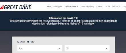“Information om Covid-19: Vi følger udenrigsministeriets rejsevejledning. I tilfælde af at der frarådes rejse til den pågældende destination, refunderes billetterne i løbet af 10 hverdage.”