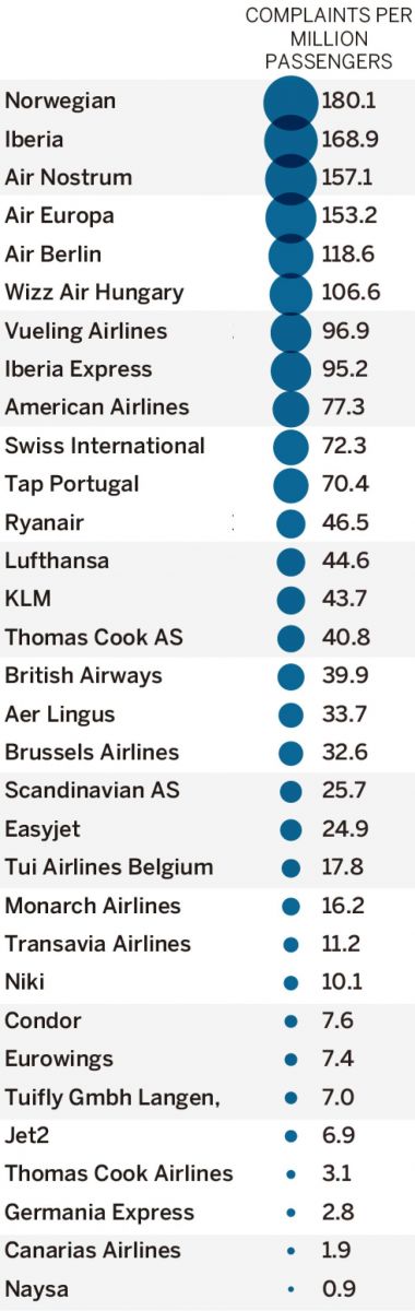 Ser man udelukkende på, hvem der fik flest klager, danner Iberia, Vueling og Ryanair Top 3.