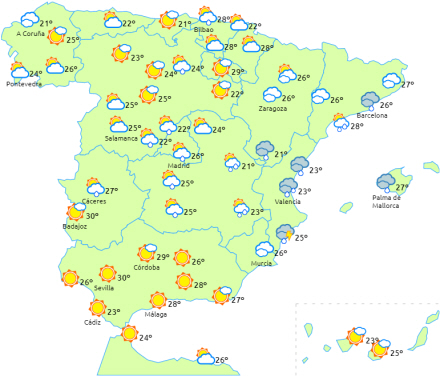 Selvom det fortsat er forbundet med en vis usikkerhed forventes det, at et frontsystem fortsætter sin passage mod øst, hvilket medfører nedbør og ustabilitet til store dele af halvøen og Balearerne.