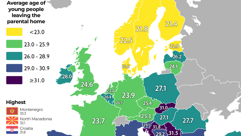 Kort over gennemsnitsalderen for, hvornår unge i Europa forlader forældrehjemmet, viser store forskelle på nord og syd.