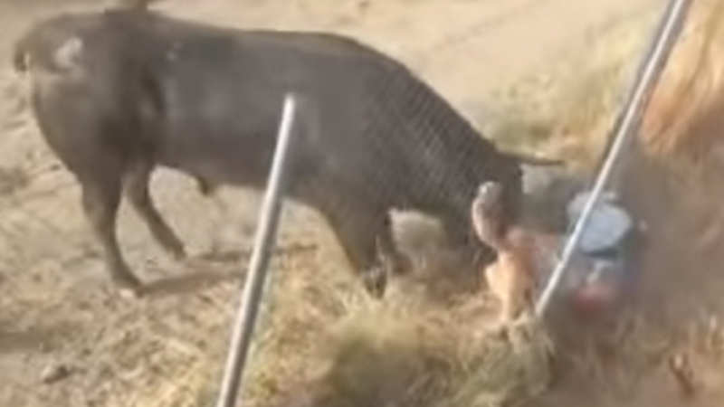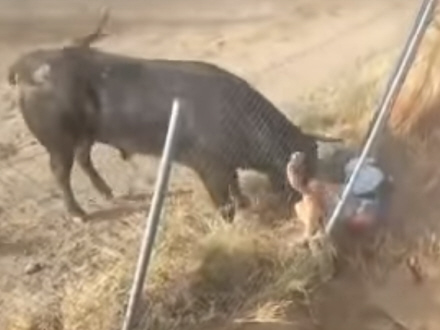 Fanget mellem det 500-kilo tunge dyr og hegnet bliver han gentagende gange stanget, indtil dyret endelig bliver distraheret af løbets ryttere.
