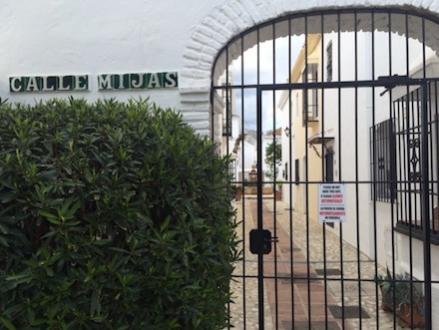 Kvinden blev fundet død her ved rækkehuset i Calle Mijas 30, der har bagudgang til Calle Los Naranjos. Politiets minetape sad der stadig mandag