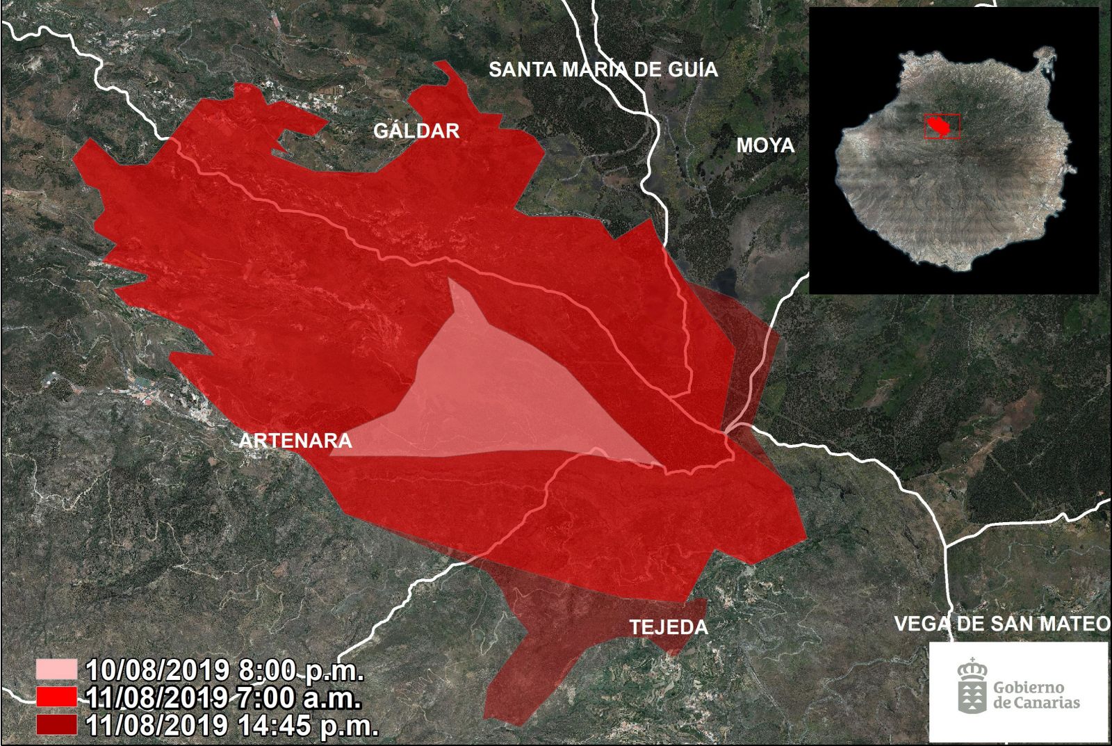Branden påvirker lige nu Artenara, Gáldar og Tejeda.