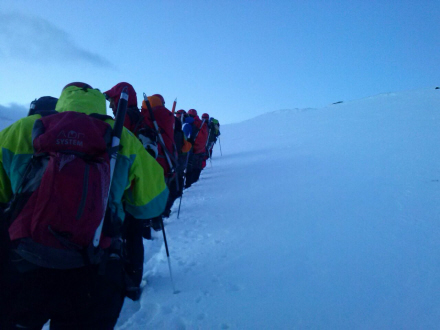 Her er vi på vej op i sneen i lang kolonne
