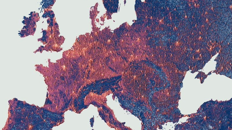 Ved hjælp af data fra Copernicus-satellitten har bloggeren Milos Popopic udarbejdet et kort, der viser de mest befolkede og de mest bebyggede områder i Europa.