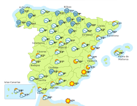 I dag forudsiger Aemet regnskyl i Galicien, som i løbet af dagen vil brede sig til de cantabriske områder, de vestlige Pyrenæer og – omend mere svagt - de øvre dele af Ebro-dalen og resten af de nordvestlige egne af halvøen.