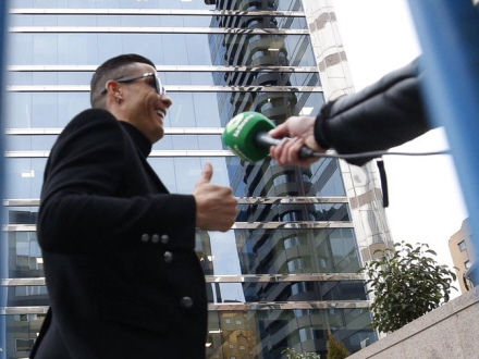 Ronaldo gik storgrinende ind i retten klædt i et sort jakkesæt og hvide og guldfarvede sko. han fik lige tid til at stoppe og give en autograf til en fan. På vej op ad den 50 meter lange trappe, spurgte en, hvordan han har det, hvortil han svarede: "Perfekt".
