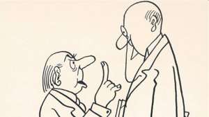 Bag teater-tæppet sidder Storm P. Selv om mange andre kræver ophavsretten til “Det er svært at spå - især om fremtiden”, så kender jeg det bedst fra Storm P’s egen tegning om det.