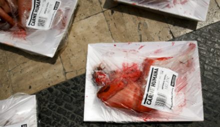 Aktivisterne smurte deres kroppe ind i falsk blod og pakkede sig i Styrofoam pakker for at symbolisere gigantiske kødbakker, skriver The Local.