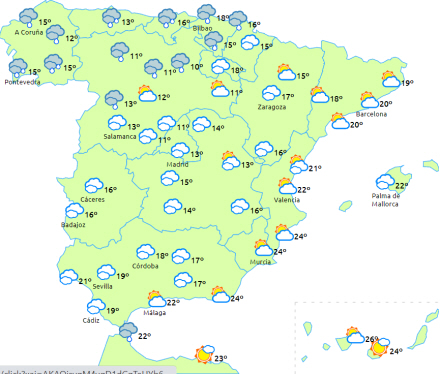 Ny Atlanterhavsfront ventes over halvøen og Balearerne, hvilket giver overskyet himmel og nedbør, der er mest udbredt i Galicien og i områderne langs nordvestkysten. Nedbøren breder sig fra nordvest til sydøst i løbet af dagen til andre dele af den nordvestlige halvdel og vil være mere intenst i bjergene.