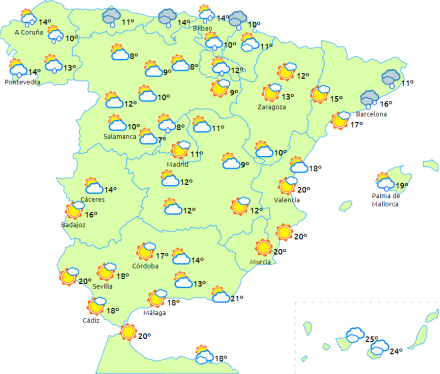 Dagstemperaturerne vil falde på den sydlige halvdel af halvøen og nattemperaturerne falder på den sydøstlige halvdel samt i de nordvestlige områder af halvøen. Frost i bjergene længst mod nord og lokalt i de centrale bjerge. Koldest i Pyrenæerne.