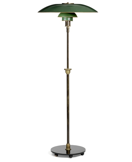 Poul Henningsen: "PH-6/3". Sjælden standerlampe af bruneret messing med fatningshus mrk. "Pat. Appl.", opsat på fod med seks kugler af sortmalet træ, monteret med originale skærme af grøn/bronze kobber. Udført 1926 - 1928 hos Louis Poulsen. Hammerslag: 320.000 kr.