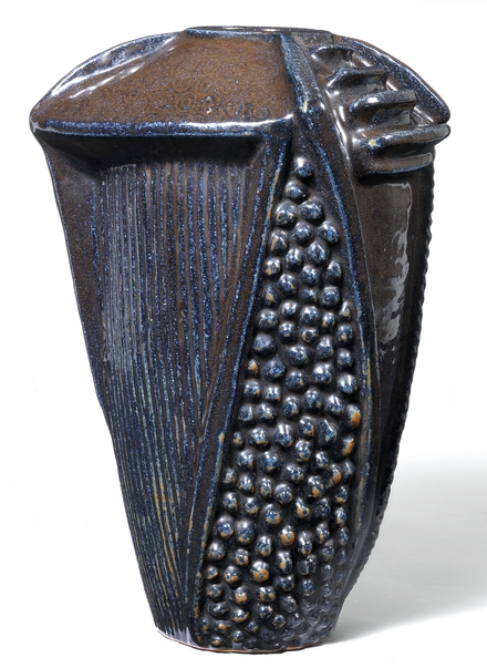 Axel Salto: Stor, imponerende vase af stentøj, modelleret i relief i bl.a. riflet og knoppet stil. Dekoreret med blåmuslingeglasur. Sign. Salto, 21323. Kgl. P. Udført i 1956. H. 45. Hammerslag: 580.000 kr.