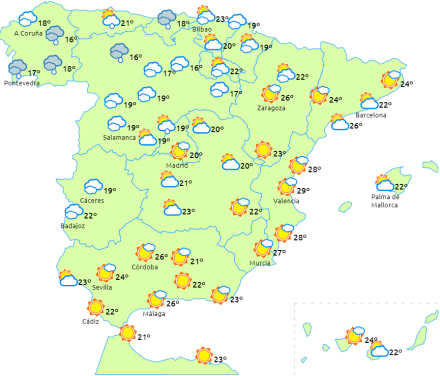Generelt stigende dagstemperaturer, hvilket lokalt kan være ret bemærkelsesværdige i store områder af halvøens indre egne. Vi ligger højere end normalen for årstiden i særligt de asturiske, catalanske og valencianske kystområder. Vi kommer et stykke over 28 grader i Middelhavsområdet, Guadalquivir-dalen og dele af Ebro-dalen.