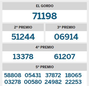 1. præmien 71198 er solgt i Lugo, Málaga, Huesca, Jaén, Torrejón de Ardoz (Madrid), Santander, Cádiz, Las Palmas, Murcia, Tenerife y Valencia