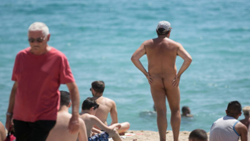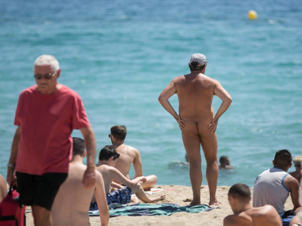 På en sen juli-morgen kunne man se 20 nudister på Mar Bella strand omringet af turister i badetøj.