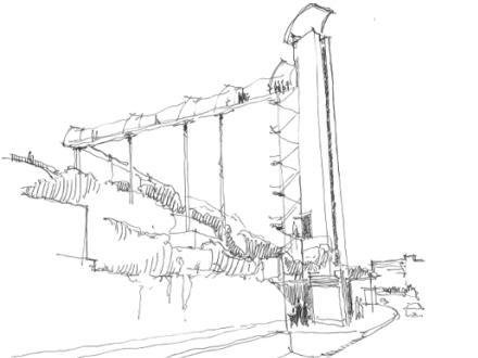På den ene side selve strukturen med en elevator, hvor man kan se ud hele vejen rundt. Kabinerne bliver lukkede, men delvist med glas og med plads til otte personer i hver.