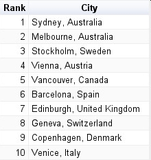 Barcelona blev slået af Sidney, Melbourne, Stockholm, Wien og Vancouver. København måtte nøjes med en 9. plads