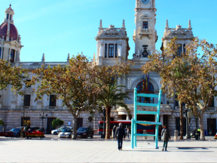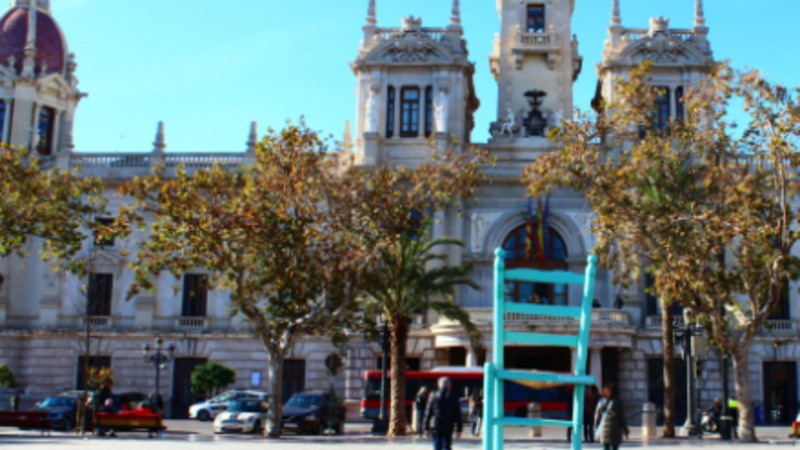 Hvorfor står der en stol på rådhuspladsen i Valencia? Nåh, måske nogle har smidt den ud, fordi den mangler et ben…