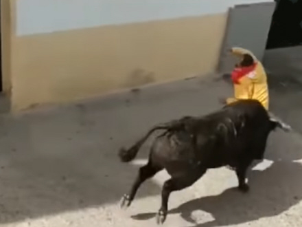 Man kan da også høres tilskuerne skrige, da manden, hvis navn ikke er offentliggjort, kommer i problemer. Tyren Trapero får fat i ham og banker ham i jorden.