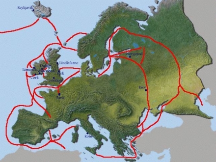 Fra Atlanterhavet kom vikingerne farende i langskibe med udsmykninger af dragehoveder på stævnene og drabelige skjolde langs siderne.