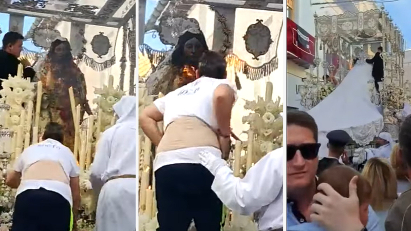 Påskeprocession i Málaga-provinsen blev i går afbrudt, da Virgen del Rocío brød i brand på sin trone.