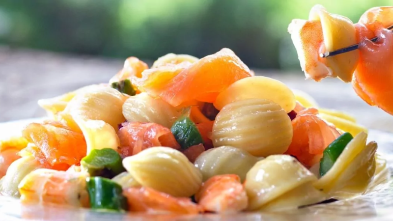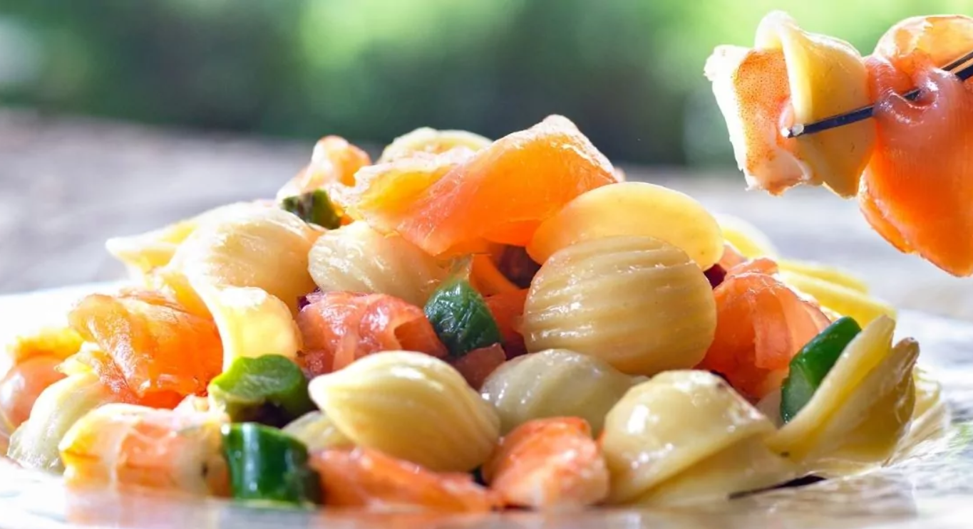 Pasta fría con salmón ahumado y queso fresco