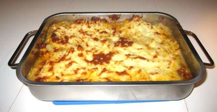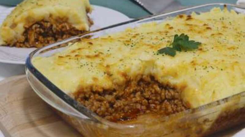 Læg kødsovsen i et ildfast fad og dæk den med kartoffelmosen i et jævnt lag. Sæt fadet i den varme ovn i mellem 20 og 30 minutter. Man kan strø ekstra ost ovenpå og give den et par minutters grill.