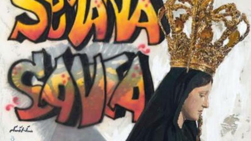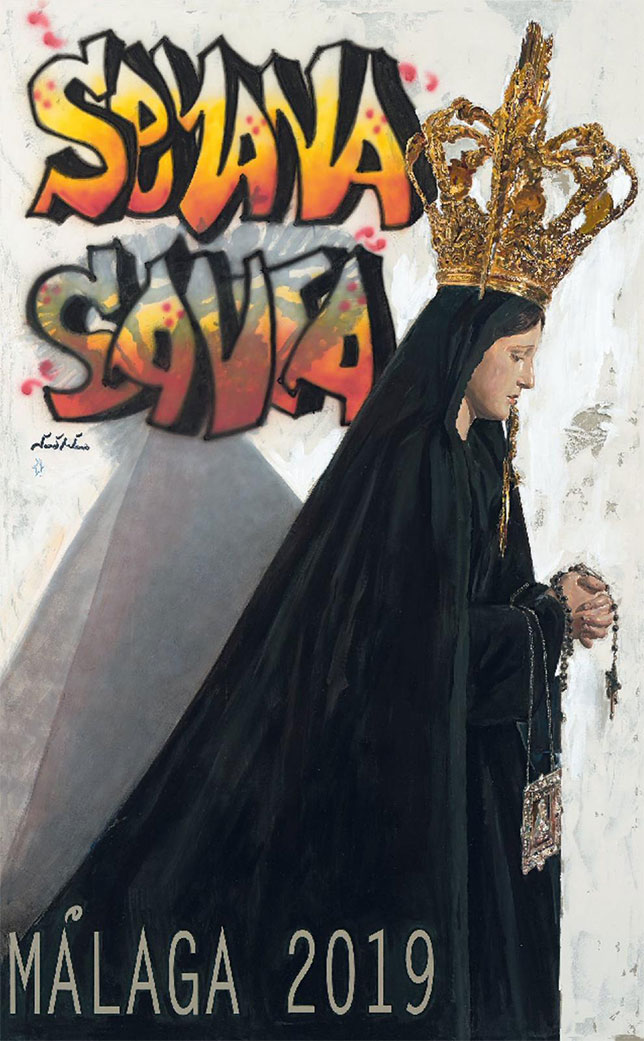 Man ser den sørgende jomfru tynget ned af den store krone og klædt helt i sort. Hendes skygge kastes på en afskallet, hvid mur med ‘Semana Santa’ skrevet med iøjenfaldende grafittibogstaver i gult og sort.