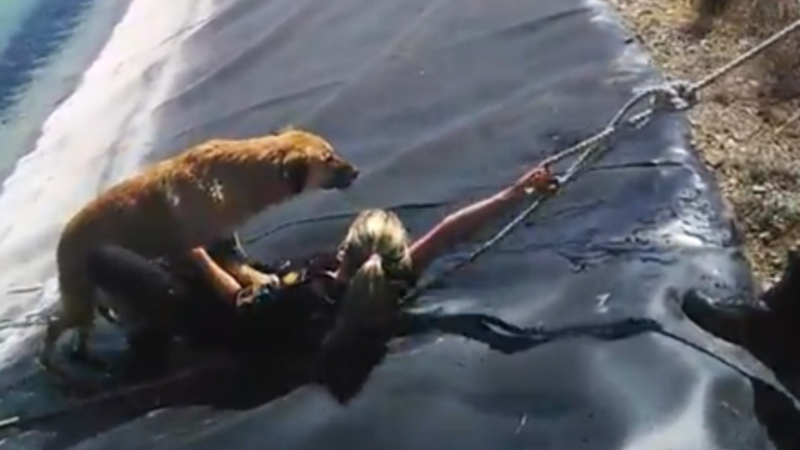 Politikvinden sænkes ned i vandreservoiret, mens hun holder fast i et reb. Her får hun så fat i hunden og holder godt fast, mens hun ved hjælp af sine kolleger trækkes op.