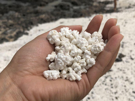 I virkeligheden er "popkornene" små stykker af hvide koraller, som er skyllet i land og blevet blandet med sten og sand fra stranden.