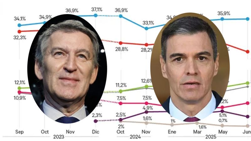 Barometeret udarbejdet af DYM for 20minutos for juni viser, at hvis der var parlamentsvalg i morgen, ville PSOE miste hele 5,5 procentpoint i forhold til valget i 2023 og få 26,1 procent af stemmerne mod 28,7 procent for bare en måned siden. Dette fald øger PP's forspring, som forbliver stabilt på 36 procent, kun en tiendedel mere end i maj, men næsten tre procentpoint over resultatet ved det sidste parlamentsvalg.