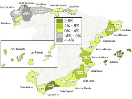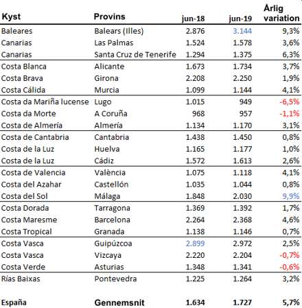 Med stigninger på under 4 procent følger Costa Blanca i Alicante (3,7%), Costa de Las Palmas (3,6%), Rías Baixas (3,2%) og Costa de Almería (3,1%)