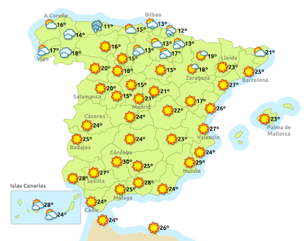 Helt konkret advarer Aemet om høje temperaturer (gul alarm) for Almería, Córdoba, Granada, Málaga, Sevilla, Zaragoza, El Hierro, Fuerteventura, La Gomera, Lanzarote, La Palma, Tenerife, Barcelona, Girona, Lleida, Ibiza, Formentera og Mallorca. Næsthøjeste alarmberedskab (orange) finder vi på Gran Canaria, Tarragona, Castellón, Alicante, Murcia og Valencia.