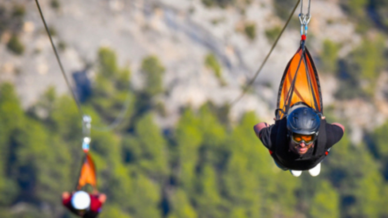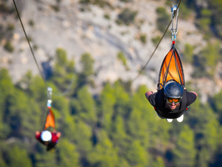 På Tirolina Fuentespalda får de eventyrlystne til at flyve gennem luften i helt præcis 1.980 meter 800 meter over havniveau, så man får fugleperspektiv på Gúdar-bjergkæden.