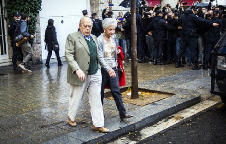 Jordi Pujol og hans hustru Marta Ferrusola forlader hjemmet under ransagningen