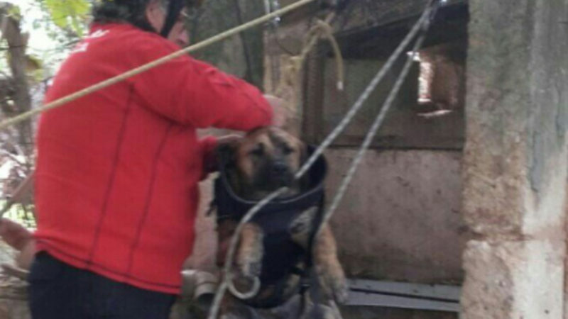 En af de lokale hørte pib fra brønden og ringede straks til alarmcentralen. Los Bomberos hastede til stedet, og en af brandfolkene tog sele og andet klatreudstyr på, for der var ingen tvivl om, at nogen - eller noget - skulle have hjælp til at komme op.
