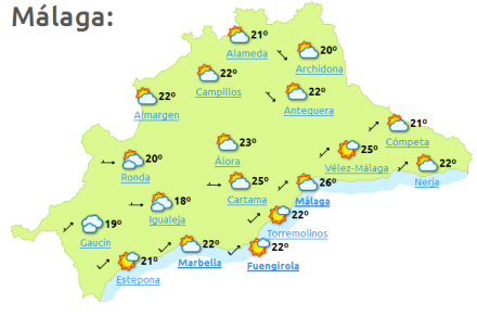 Onsdag stiger temperaturerne i det vestlige Andalusien, mens de falder i de nordlige og indre egne af halvøen og på Balearerne. Højeste temperaturer finder vi i dag i Las Palmas og Santa Cruz de Tenerife med 27 grader, 26 grader i Córdoba og Murcia, mens den kan snige sig op på 25 grader i Granada, Huelva, Málaga og Sevilla.
